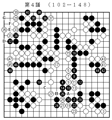 "What would you have done if white-47, -48 were extended?" asked Sanno 9-DAN after the match. Moore-san had to think hard. Since black D is very effective against white-48 (white would be dead with black-E, white-F, and black-G), it is possible to place black-47. It is quite useful to know such a basic knowledge of life and death.